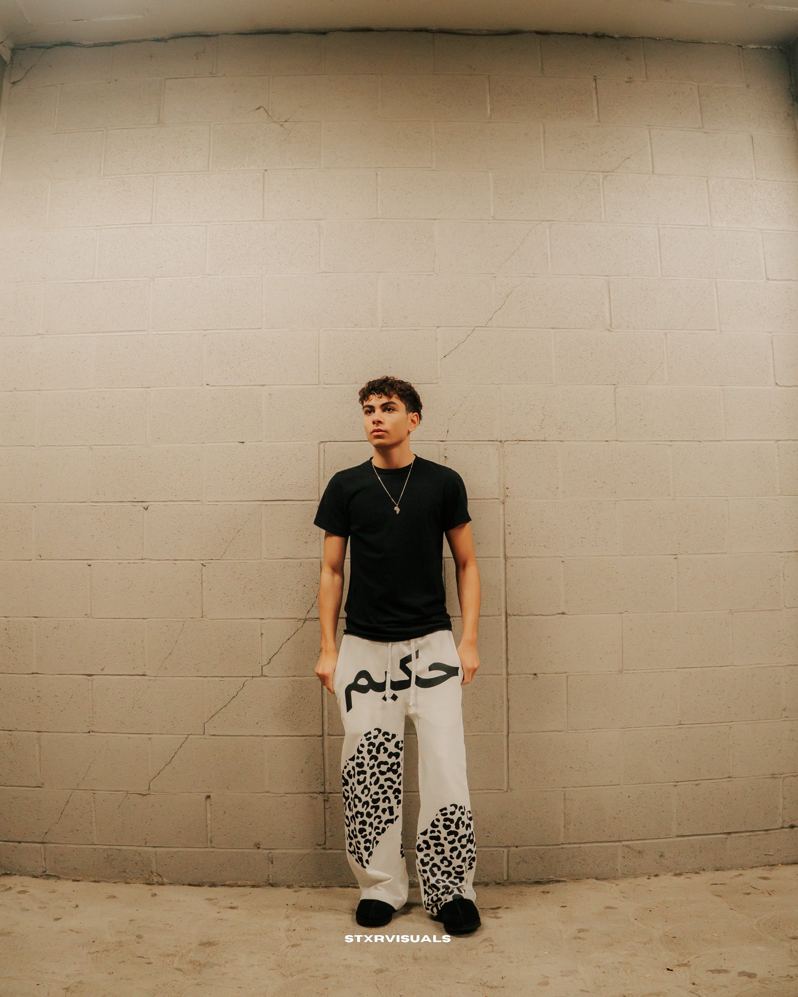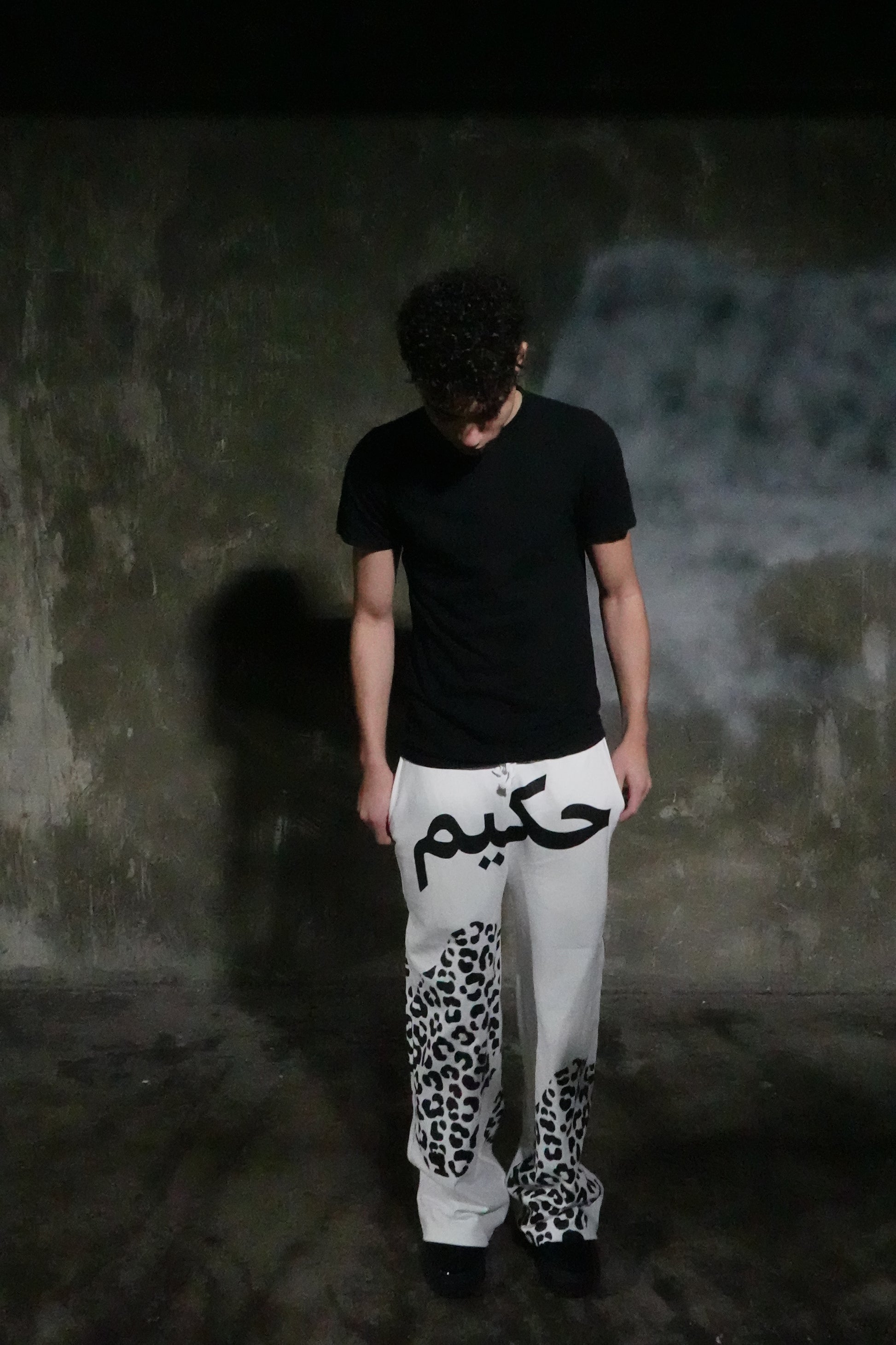 Bold, unapologetic, and culturally rich, the Hakem Leopard Patch Pants blend streetwear with statement art. Crafted from premium fabric for comfort and durability, these black wide-leg pants feature striking leopard-print patchwork on the front and back, contrasting with a bold Arabic “Hakem” script on the front waistband. The relaxed fit and elastic drawstring waist provide everyday wearability while maintaining a standout aesthetic.